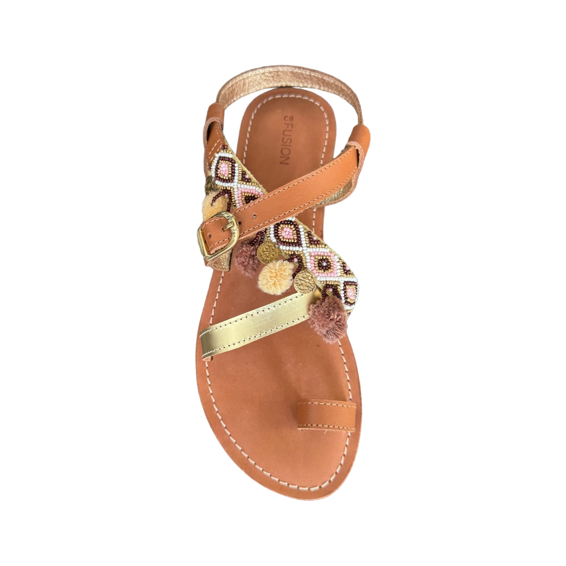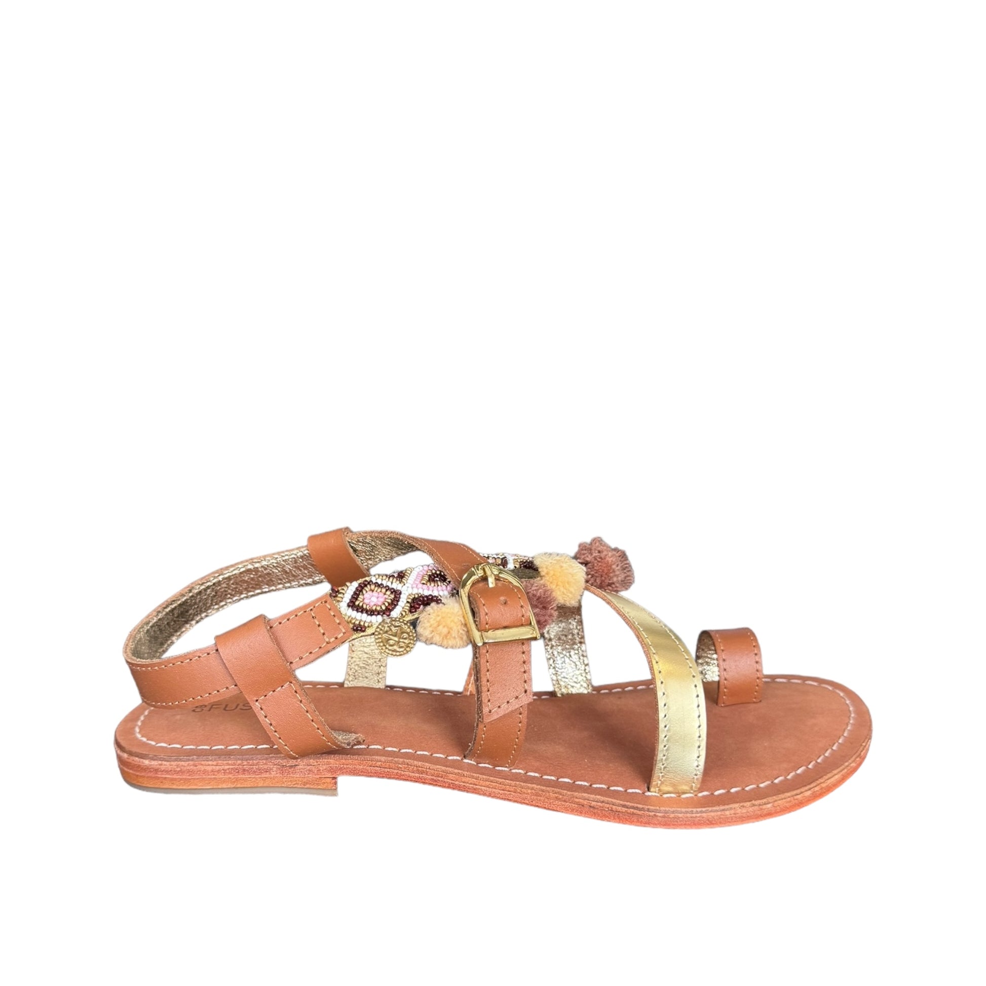 sandalo in cuoio presenta, Ha un mix di perline e nappine oro e cuoio sul davanti