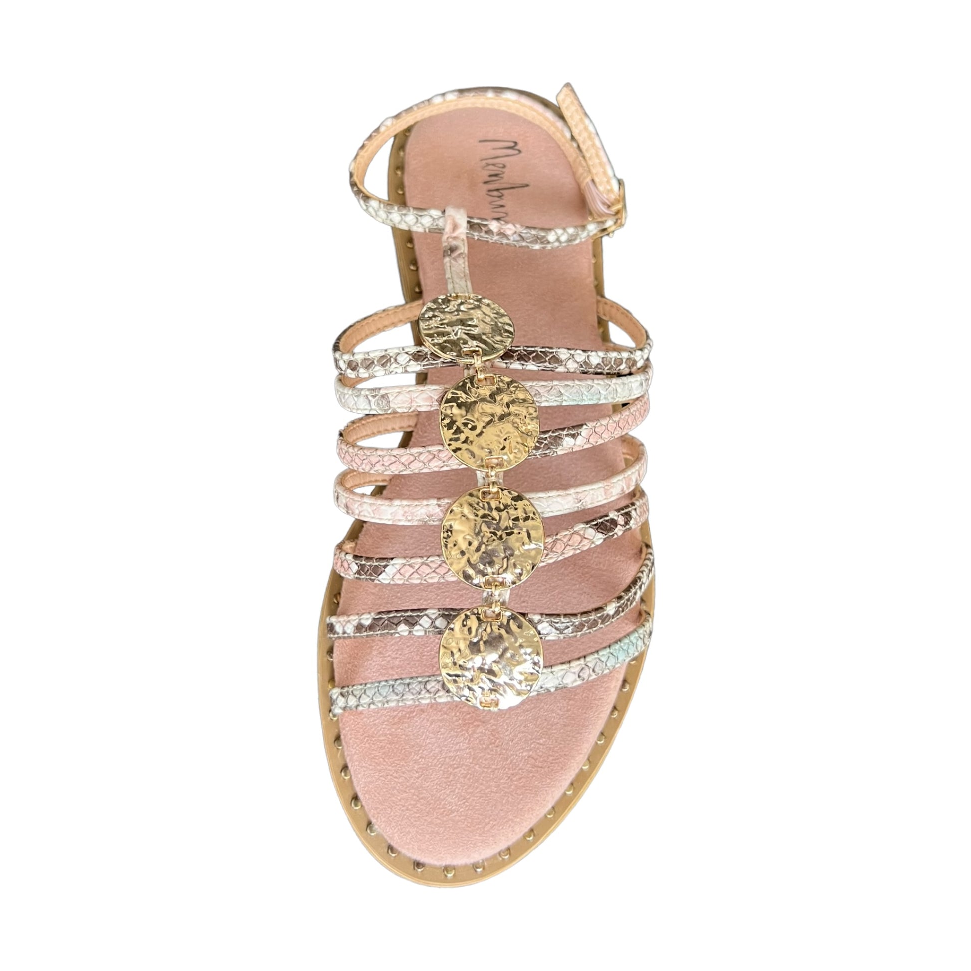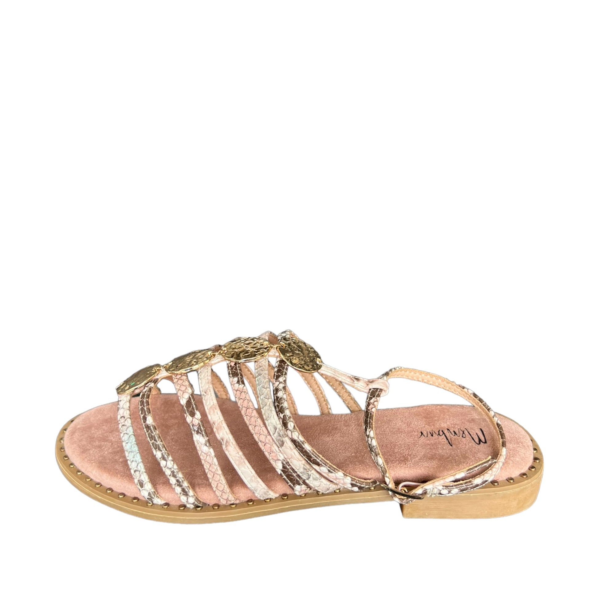 Sandalo basso aperto pitonato rosa cipria con dettagli in oro sul davanti