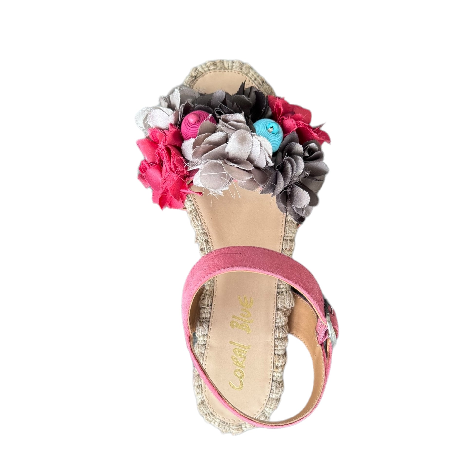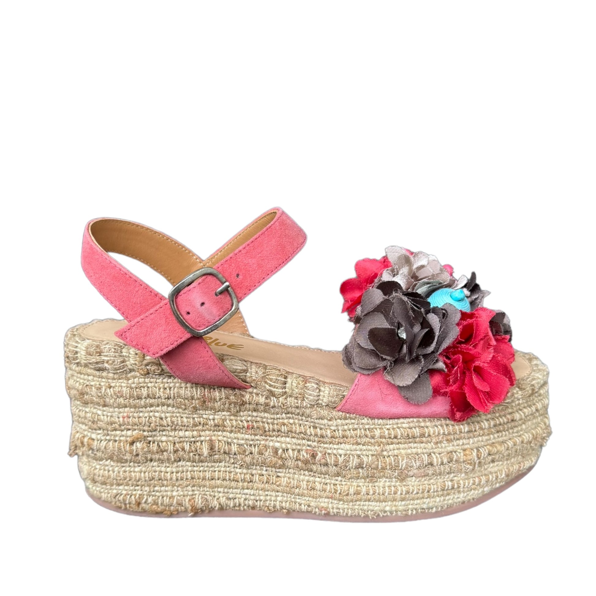 sandalo rosa e zeppa in rafia con dettagli floreali rossi e fango - COR40