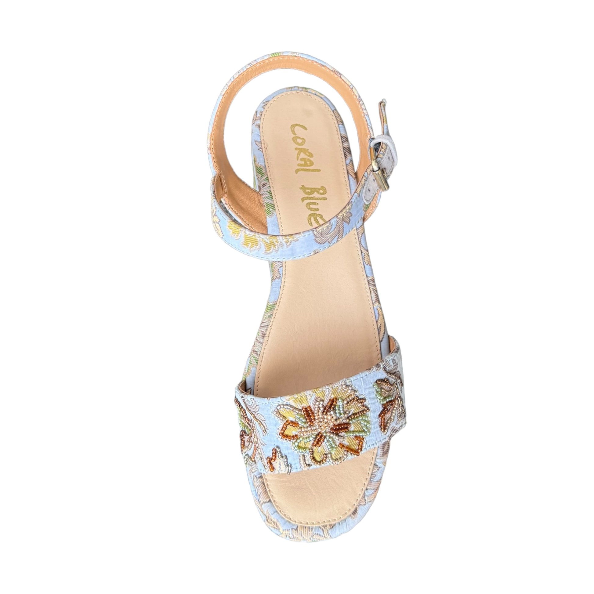 sandalo zeppa celeste cenere in tessuto con dettagli floreali e perline - SKY33