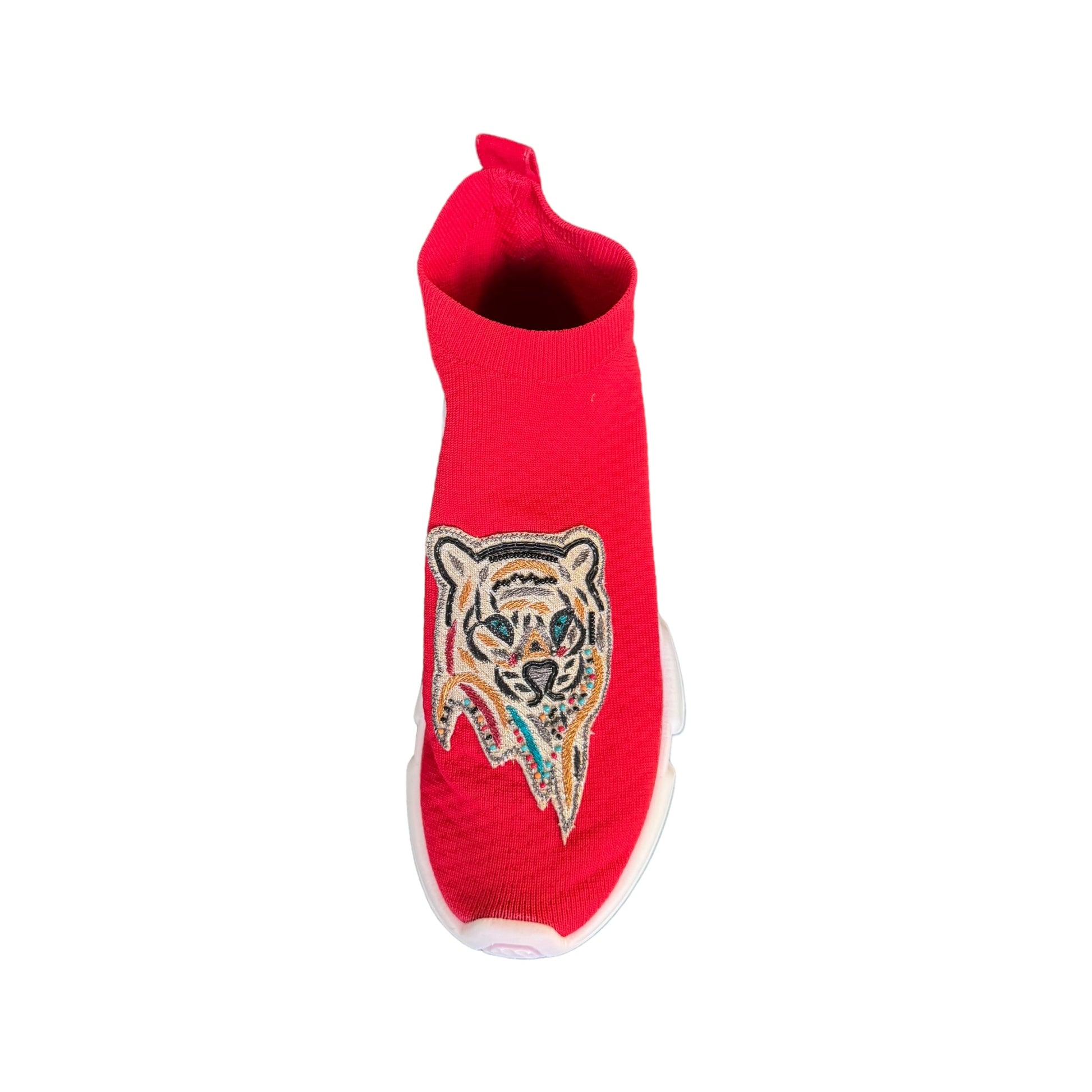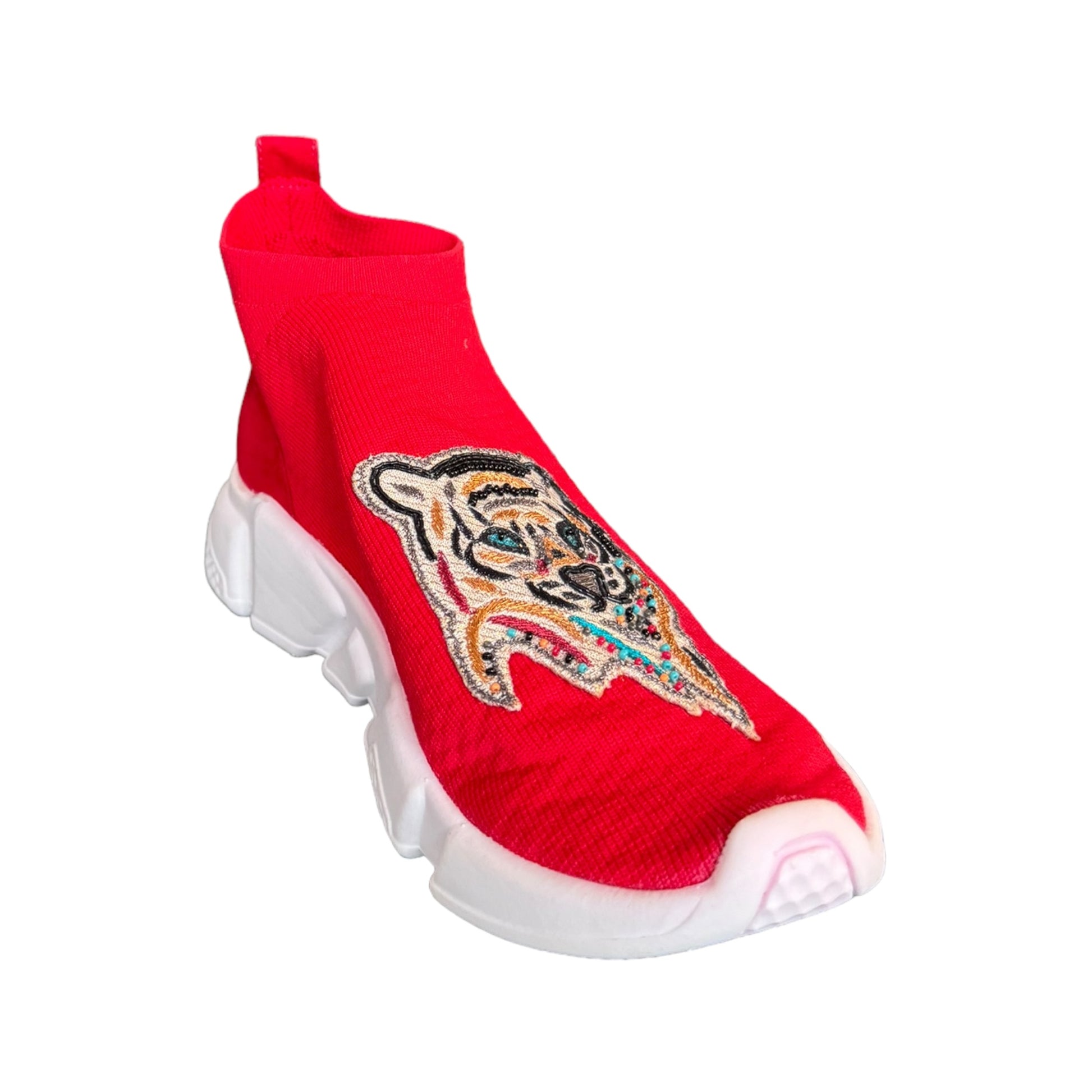 Sneakers intessuto rossa con suola bianca in gomma e tigre sul davanti in perline