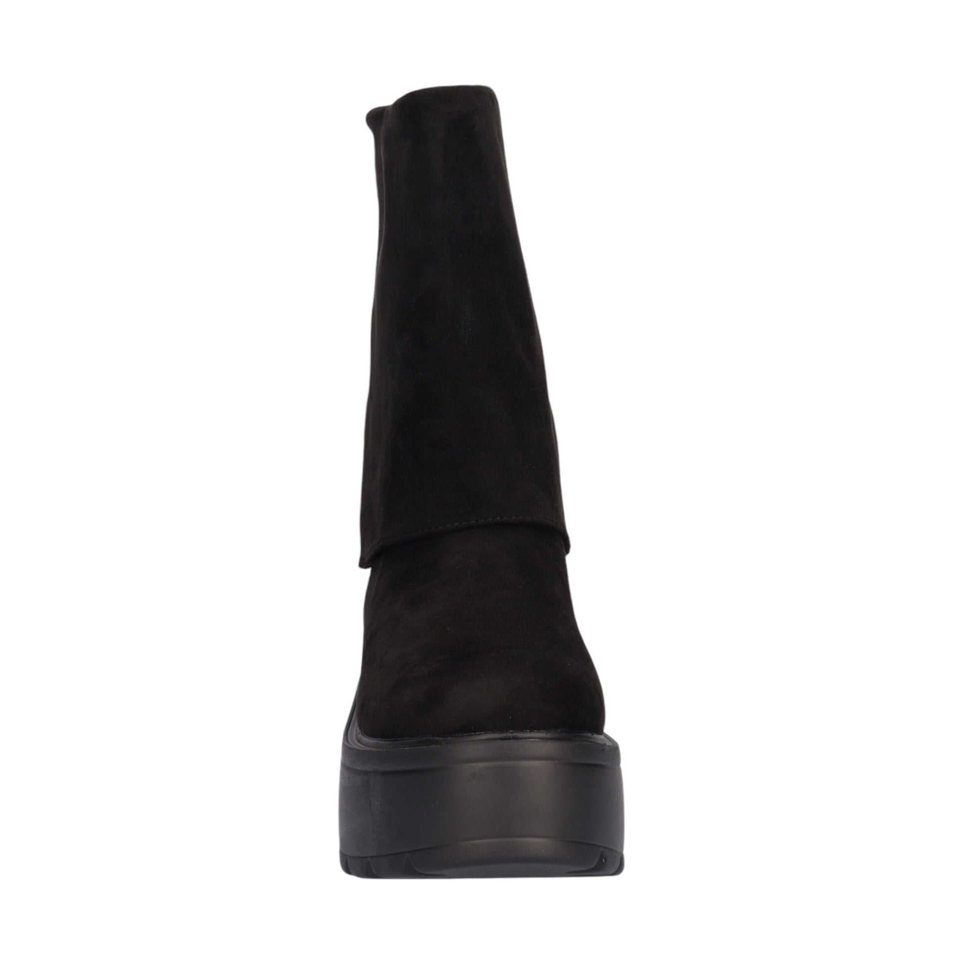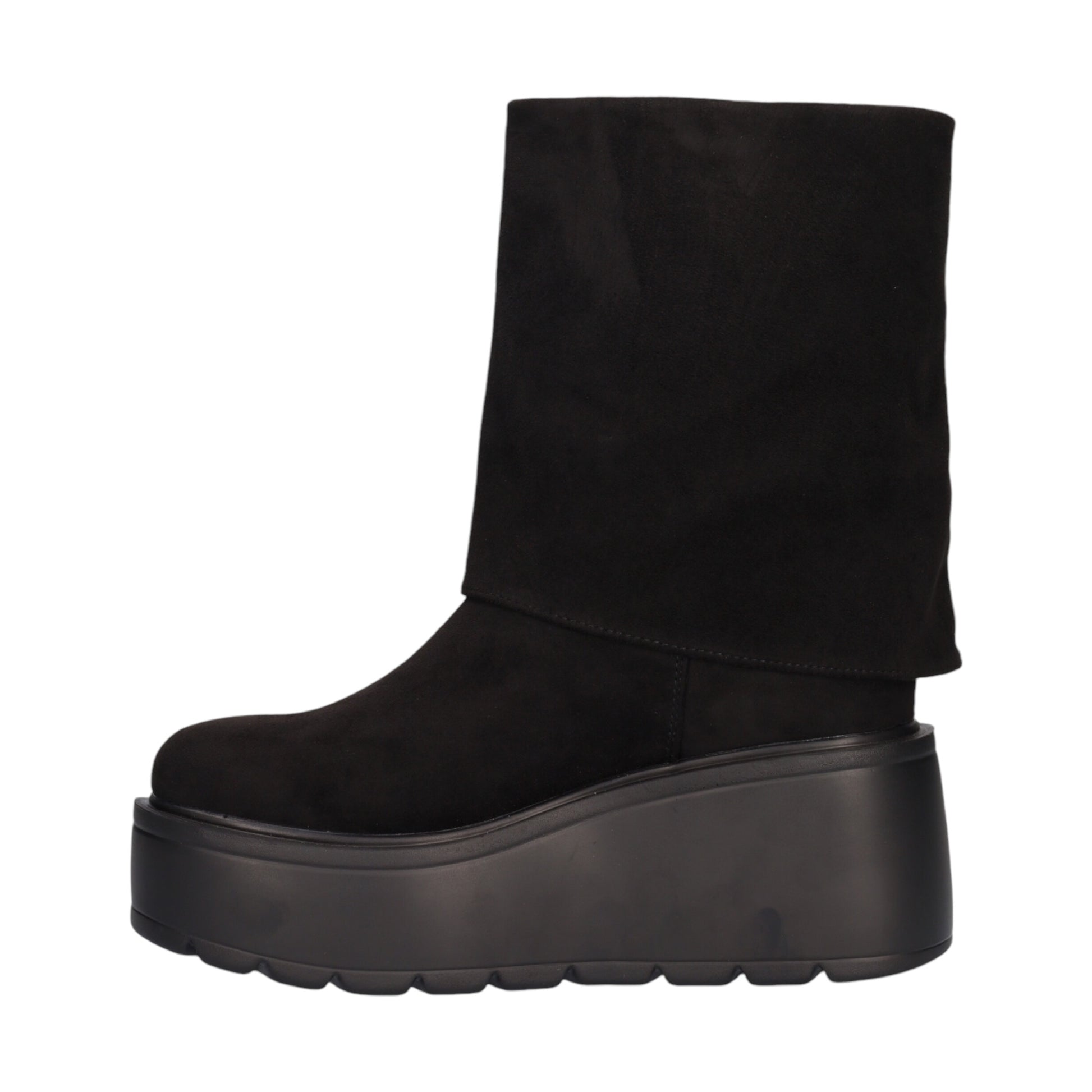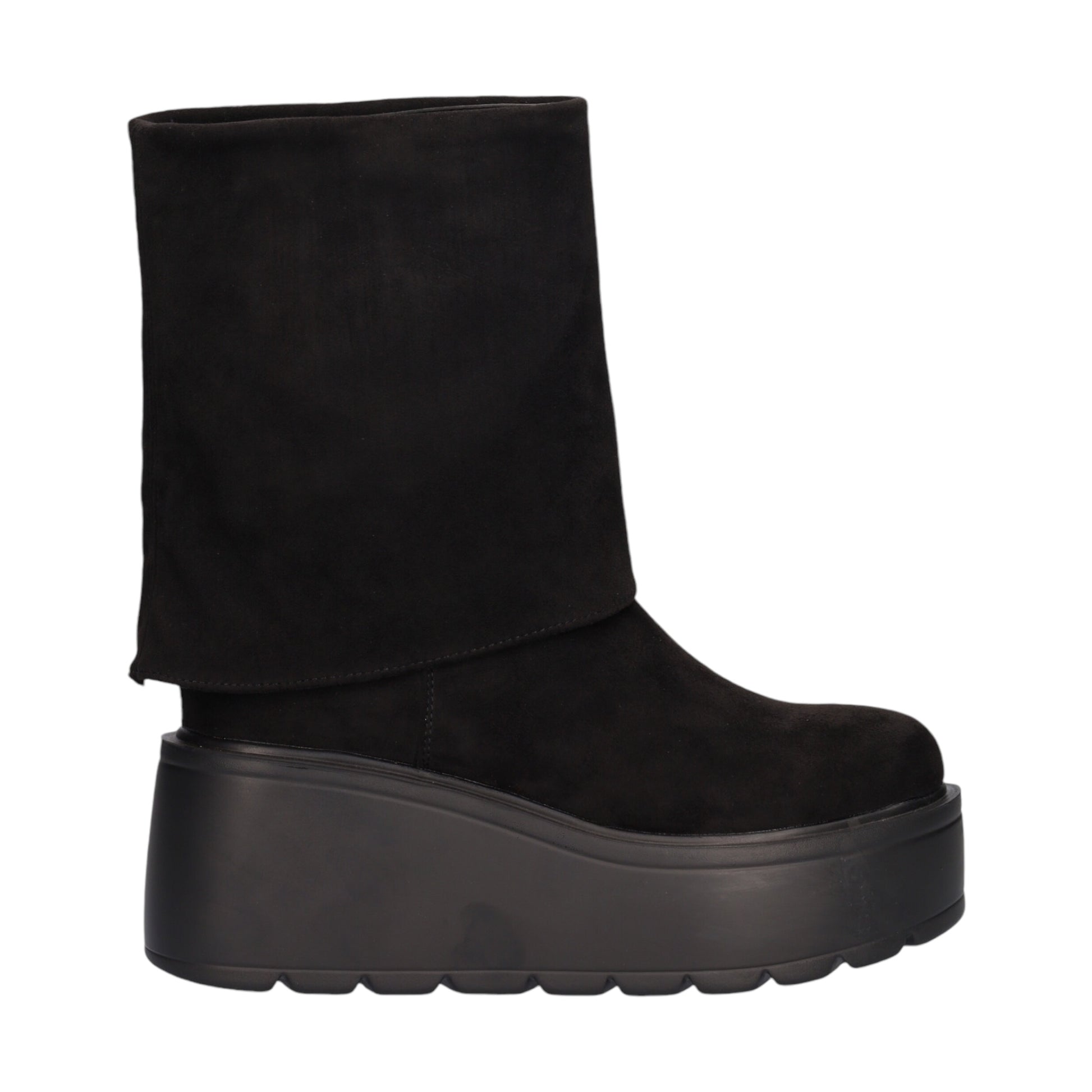 stivaletto in similcamoscio nero con risvolto, fodera in tessuto e sottopiede in ecopelle fondo in gomma e zeppa di 7cm.