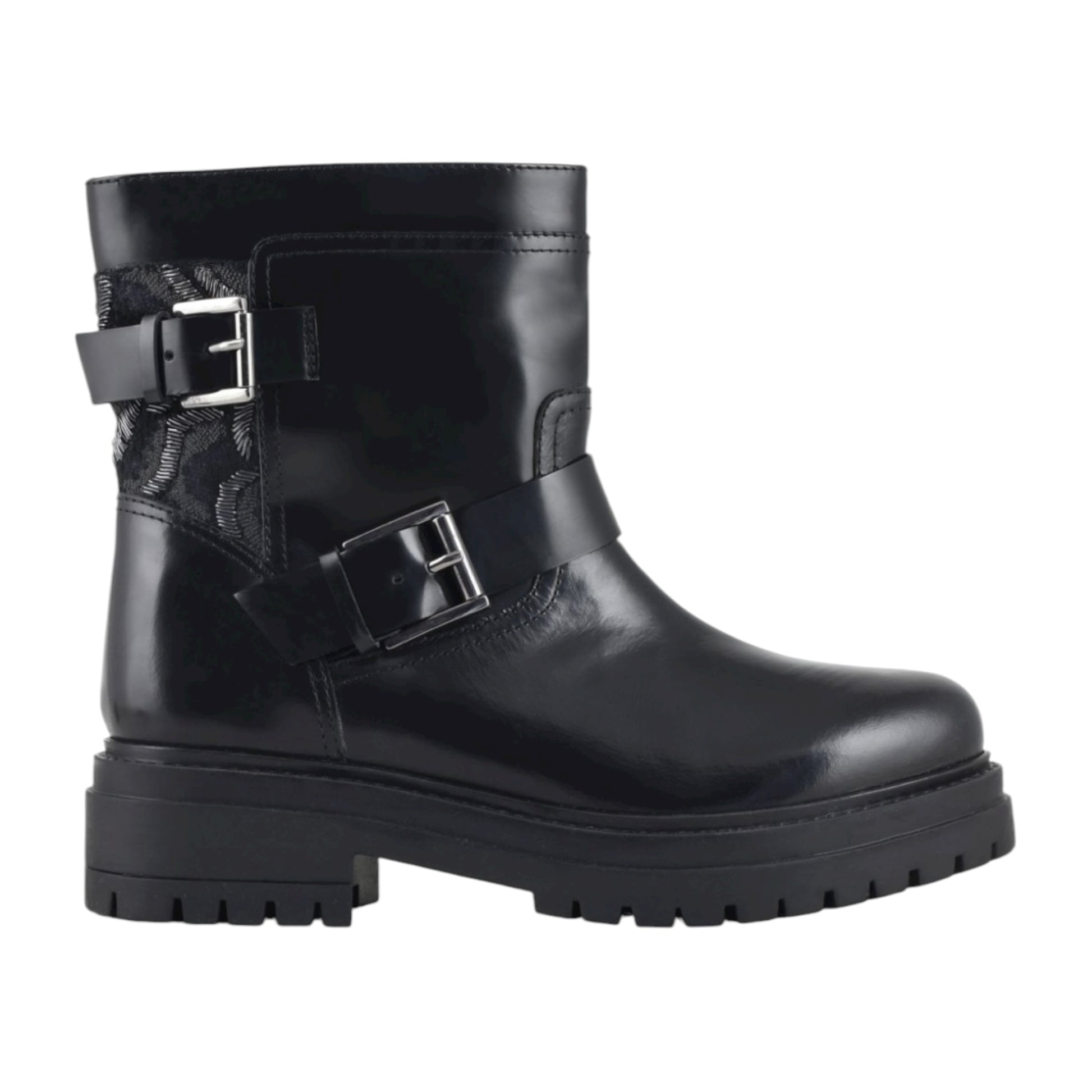 Stivaletto in pelle, doppia fibbia, tinta unita, interno in pelle e punta tonda.