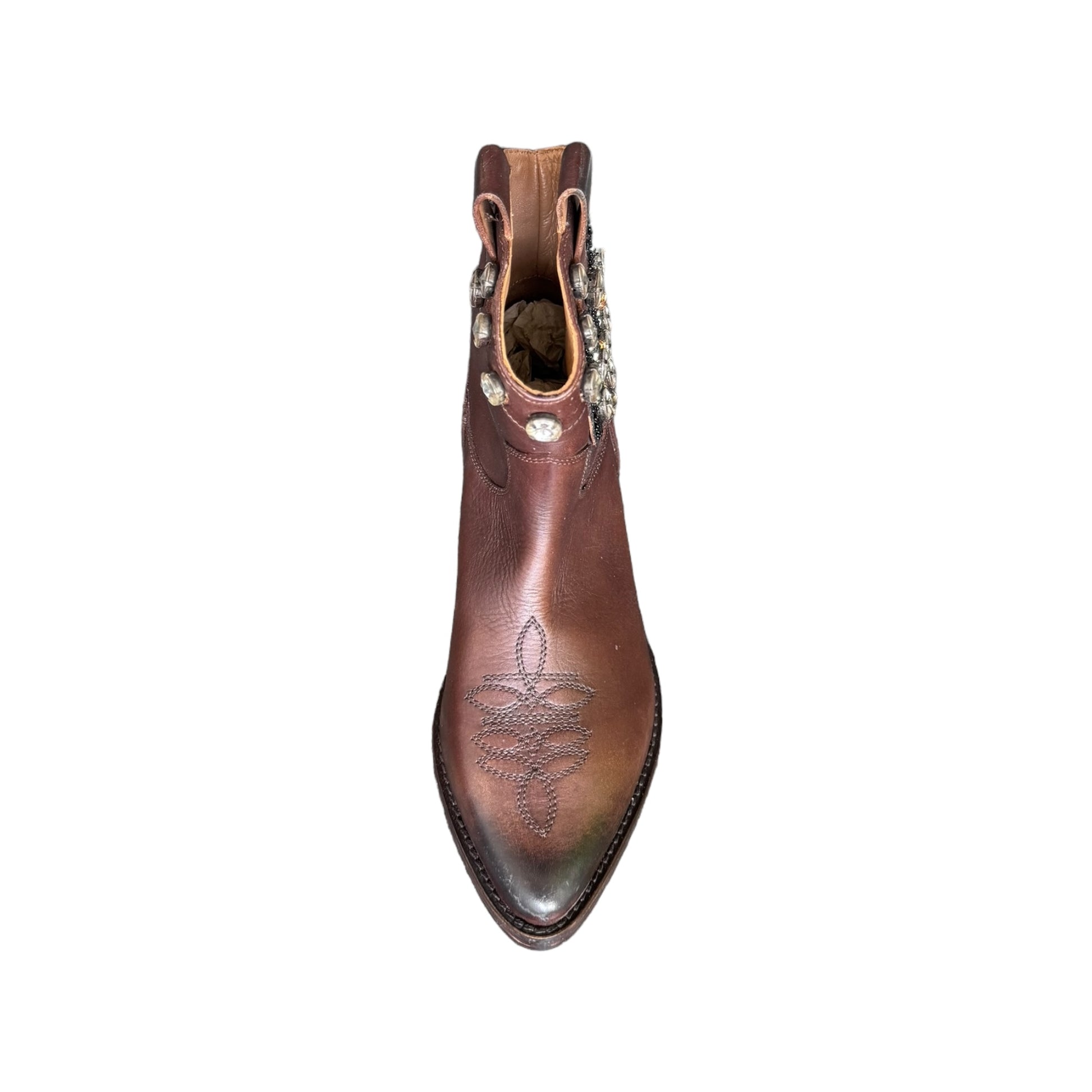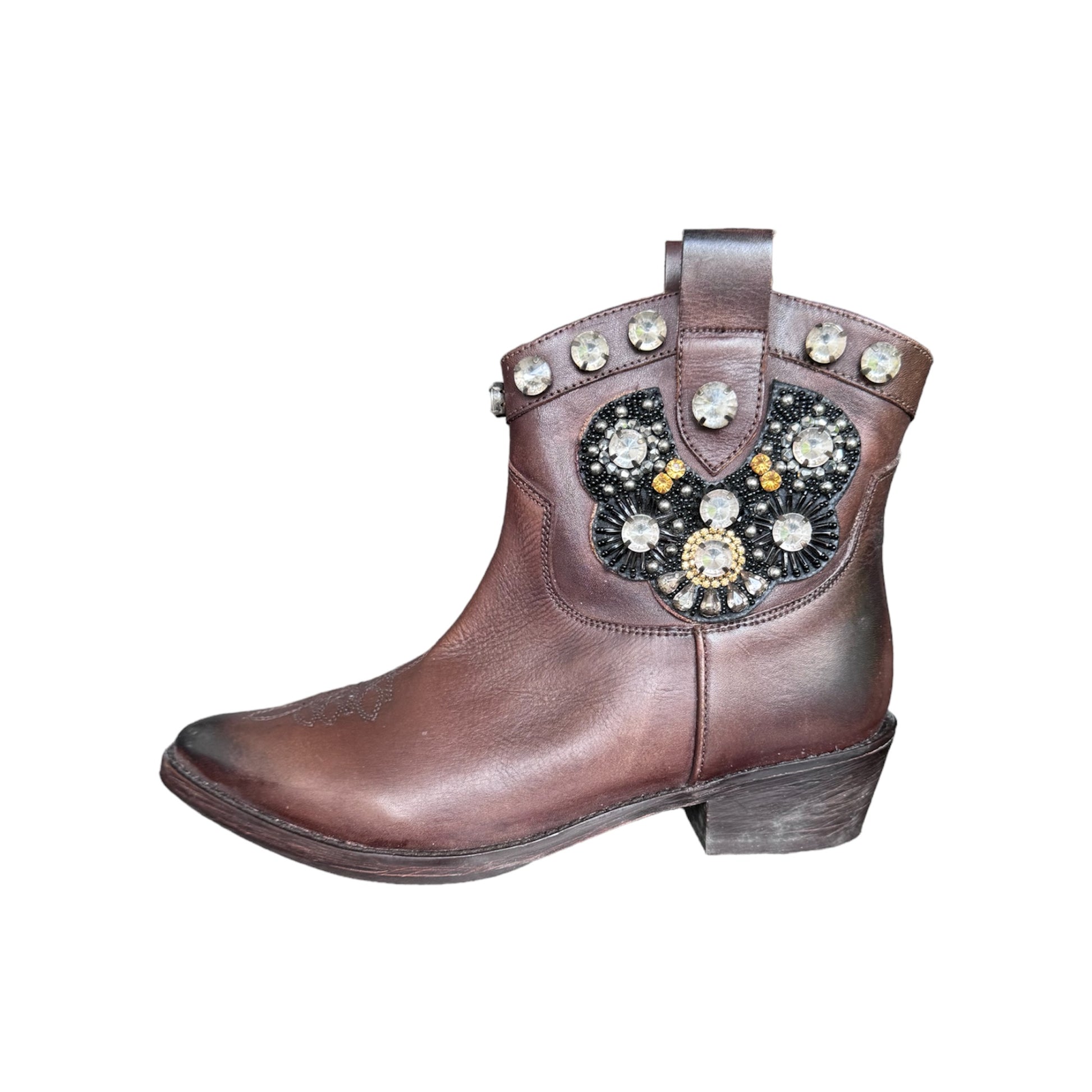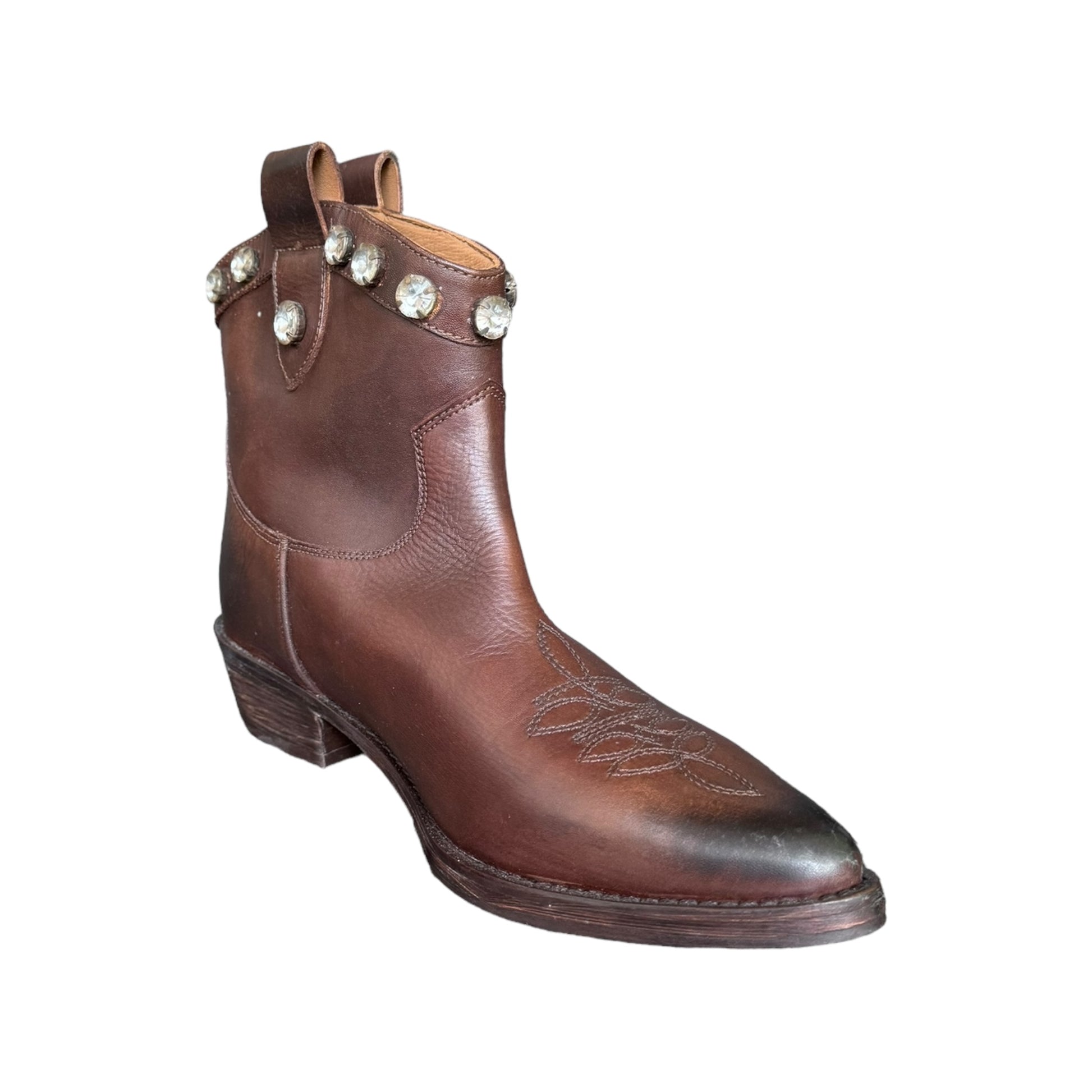 Texano marrone effetto consumato con decorazione gioiello sul lato esterno del piede e maxi strass sul lato interno.