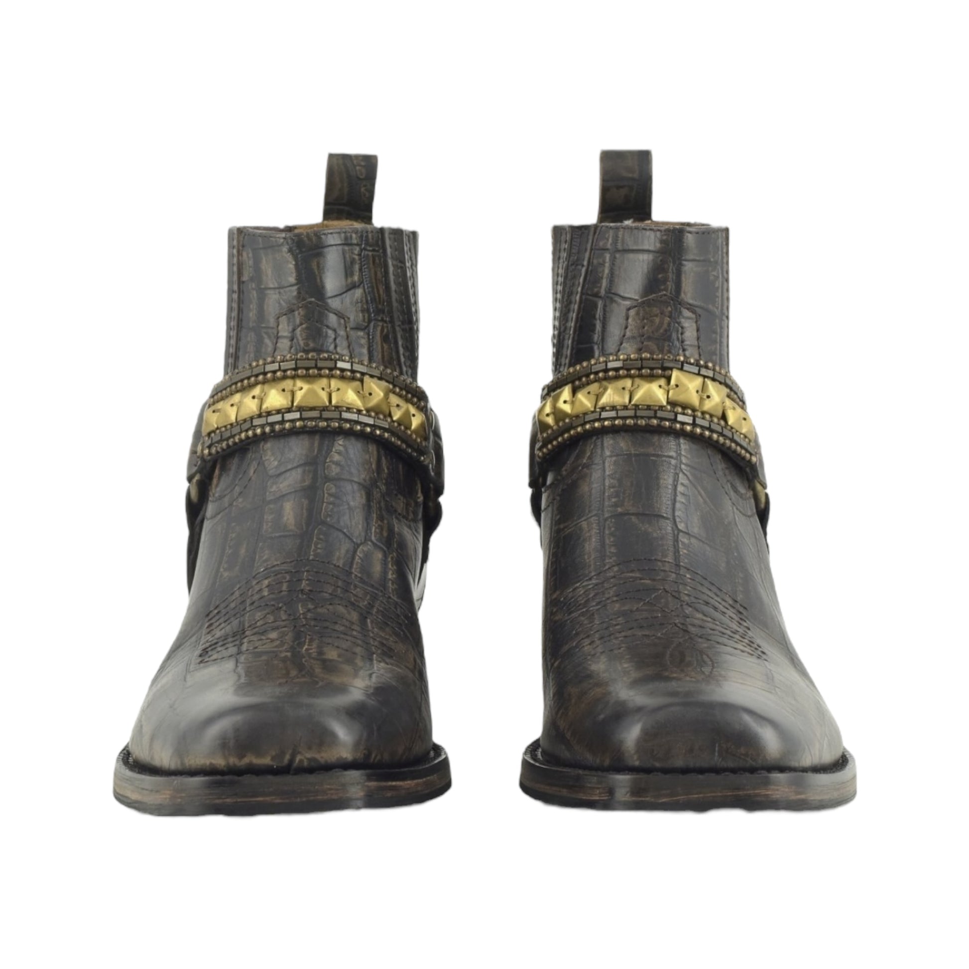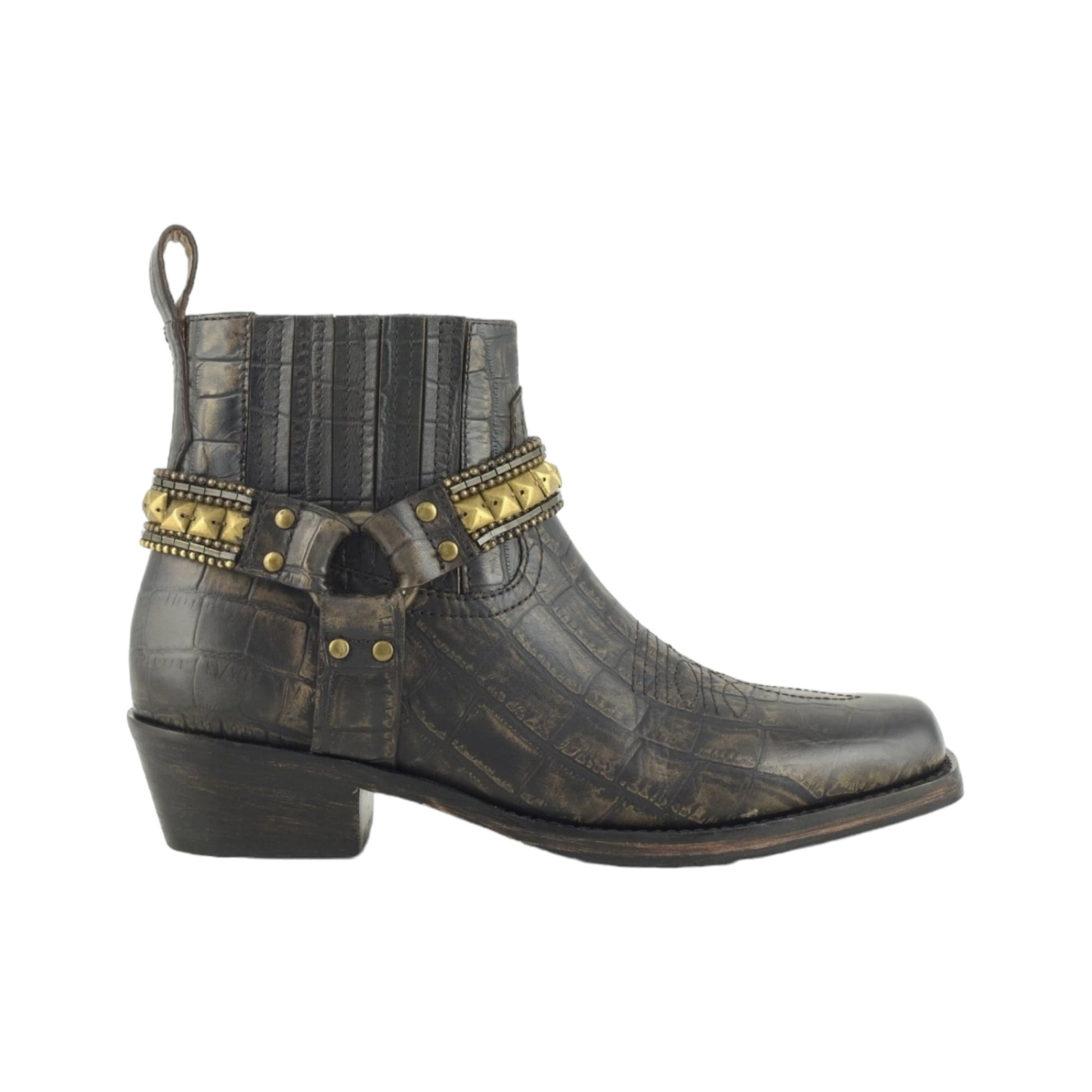 Questo stivaletto texano con punta squadrata e cinturino con borchie e catena in pieno stile country è un must have per tutti i tuoi outfit invernali: si abbina a skinny e slouchy jeans, mini abiti e maxi gonne! Difficile resisterci!