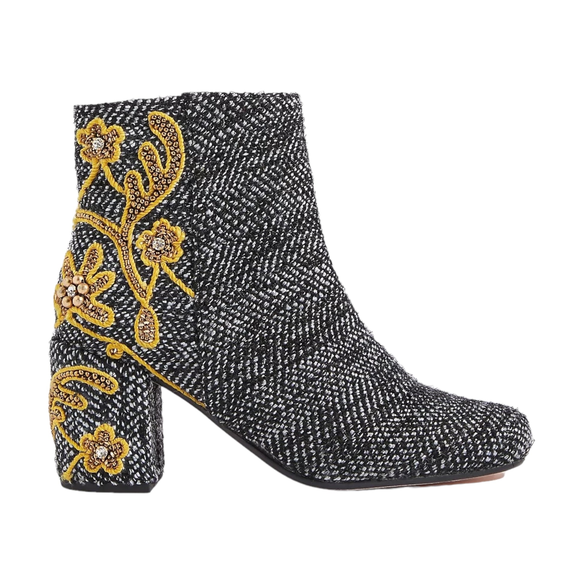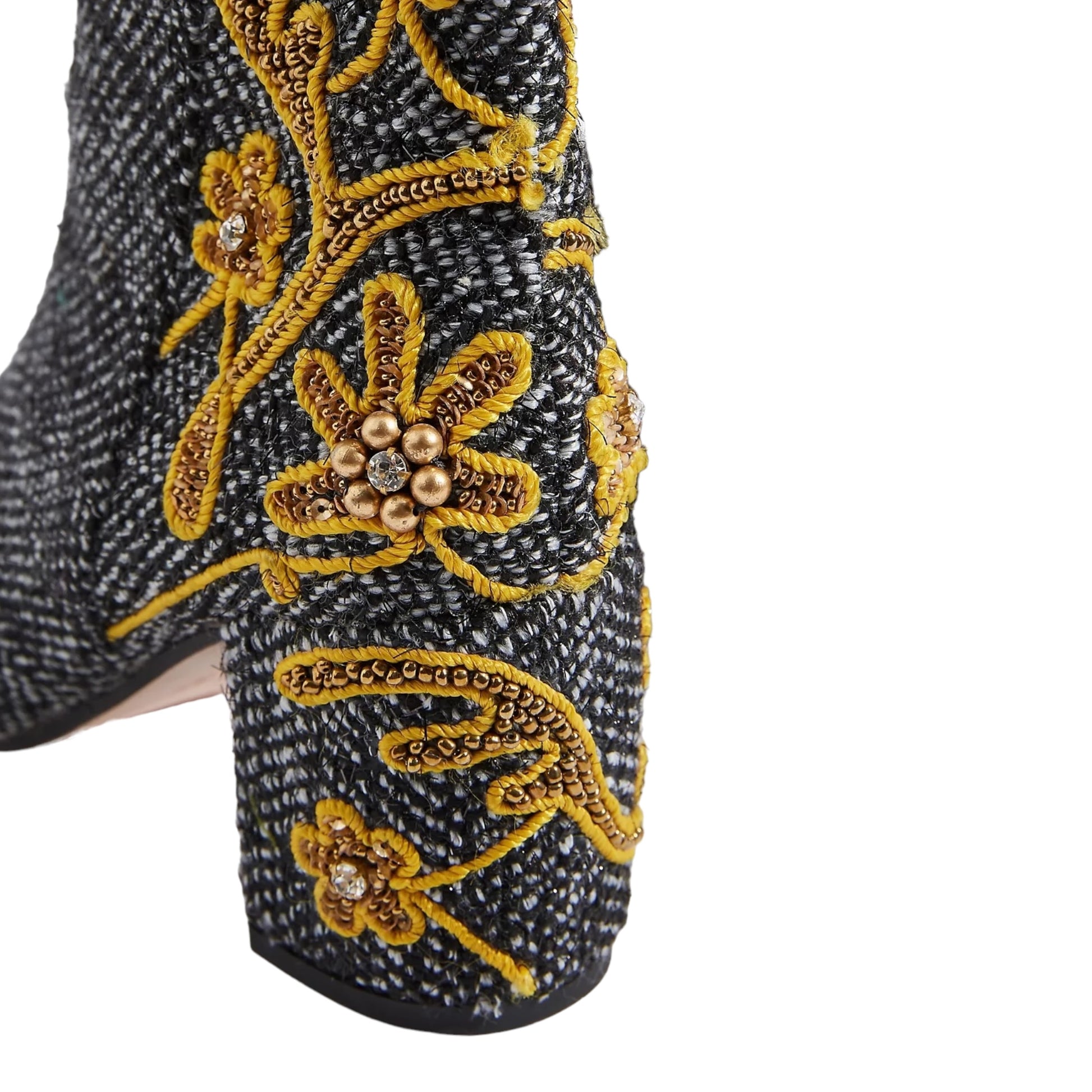 Stivaletto bianco e nero realizzato in raffinato tweed e con ricami oro