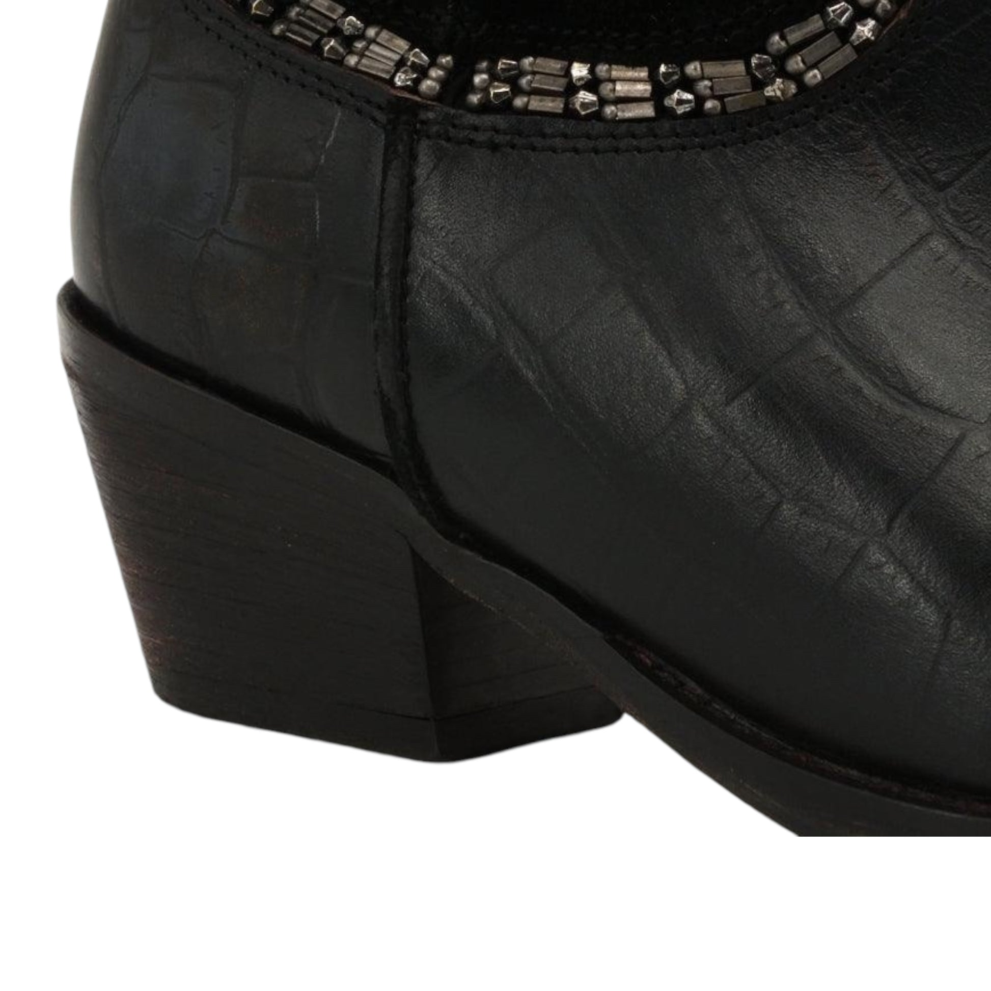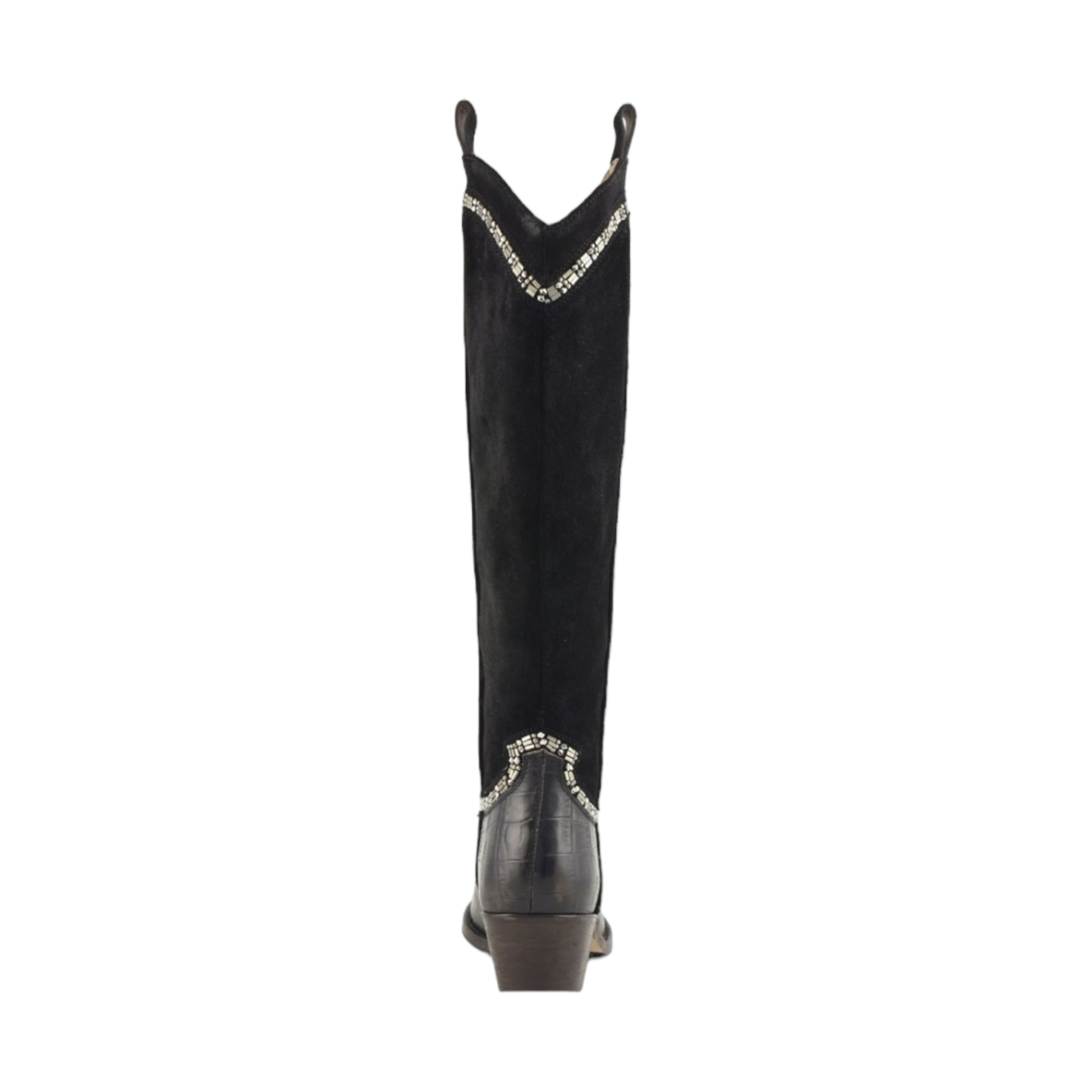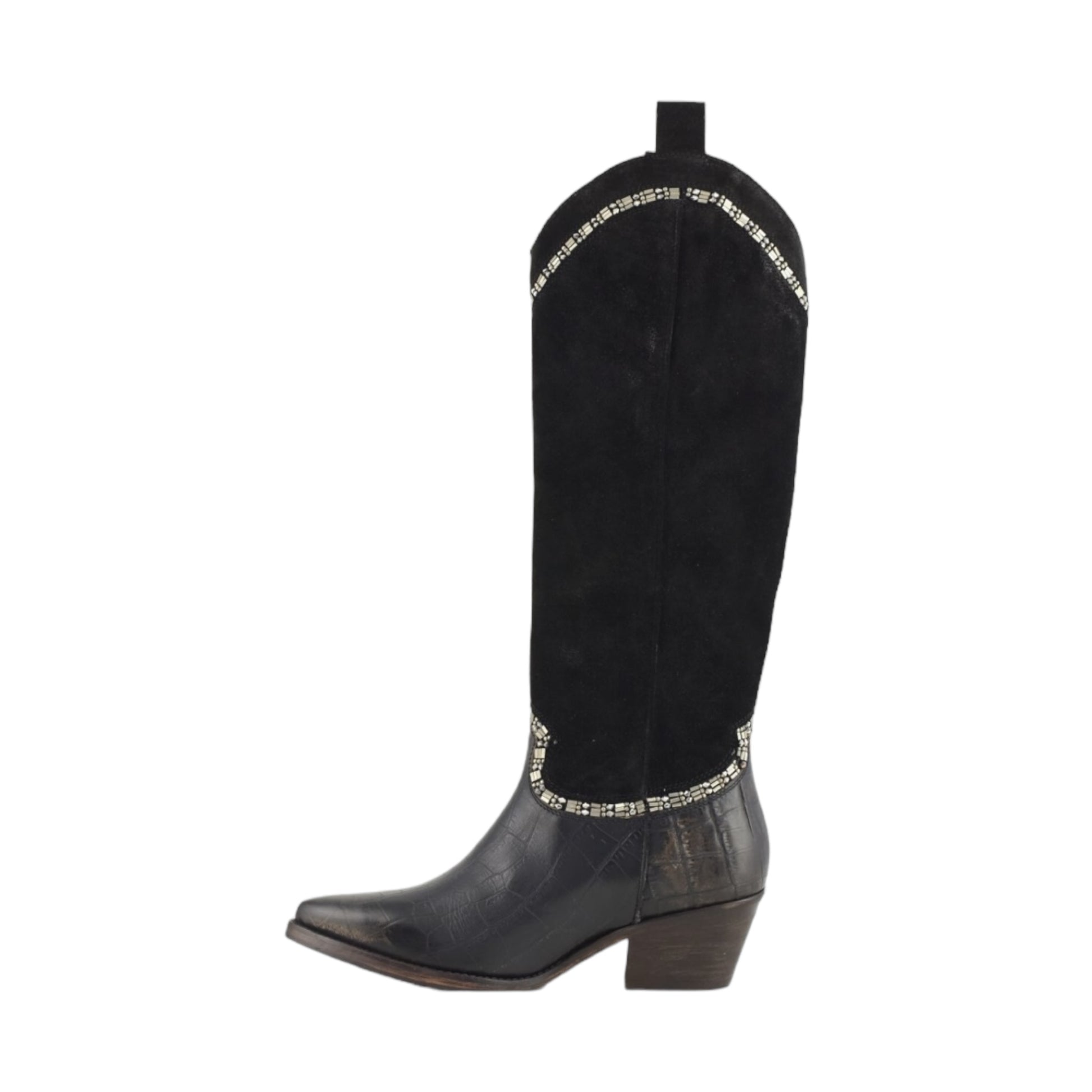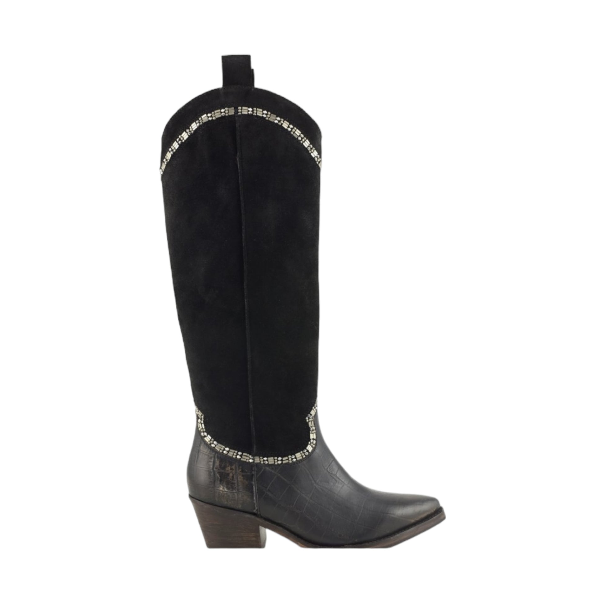 Texano alto nero mix tra vera pelle, camoscio e stampa coccodrillo con strass cuciti a mano.