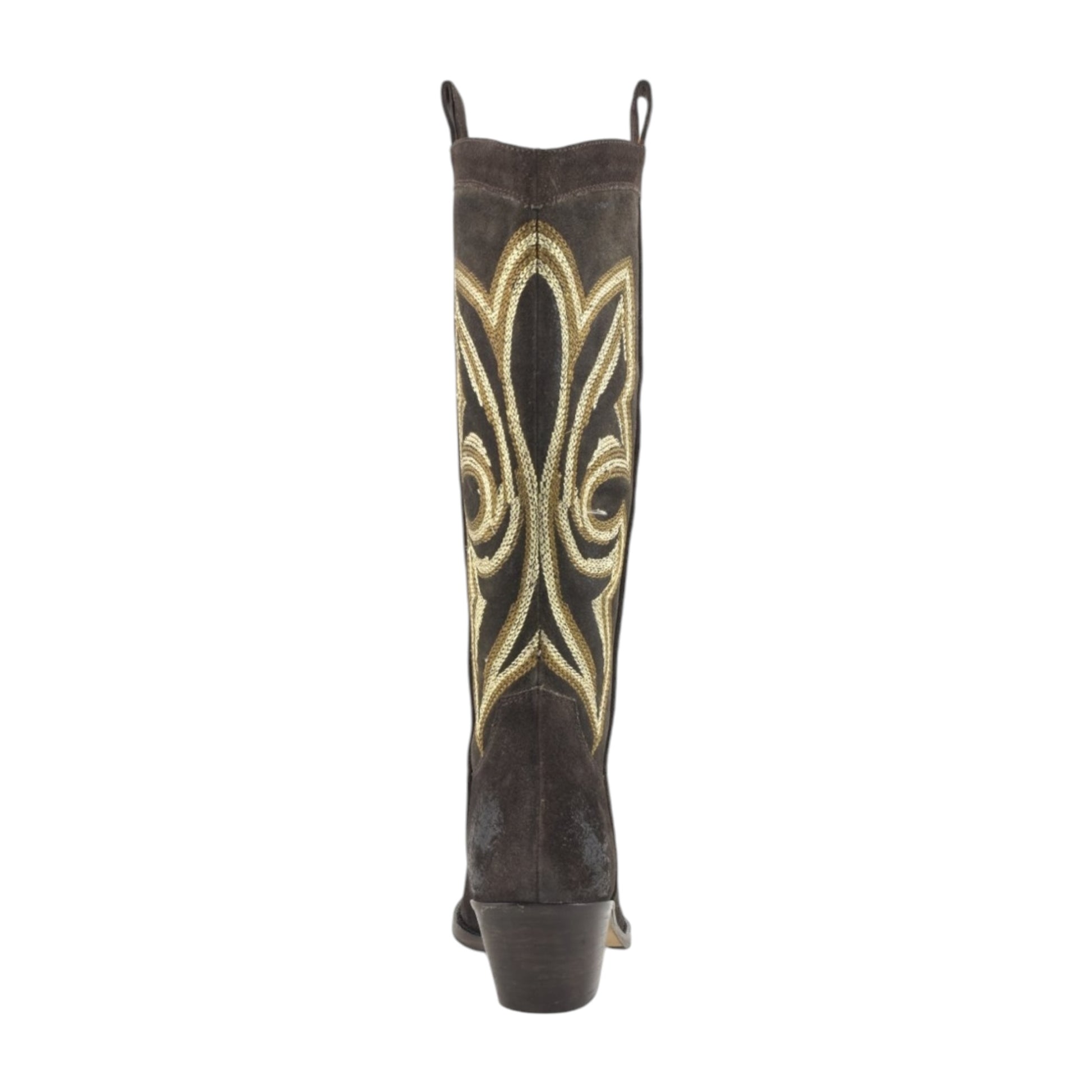 Texano alto marrone mix tra vera pelle e camoscio, dettagli cuciti a mano.