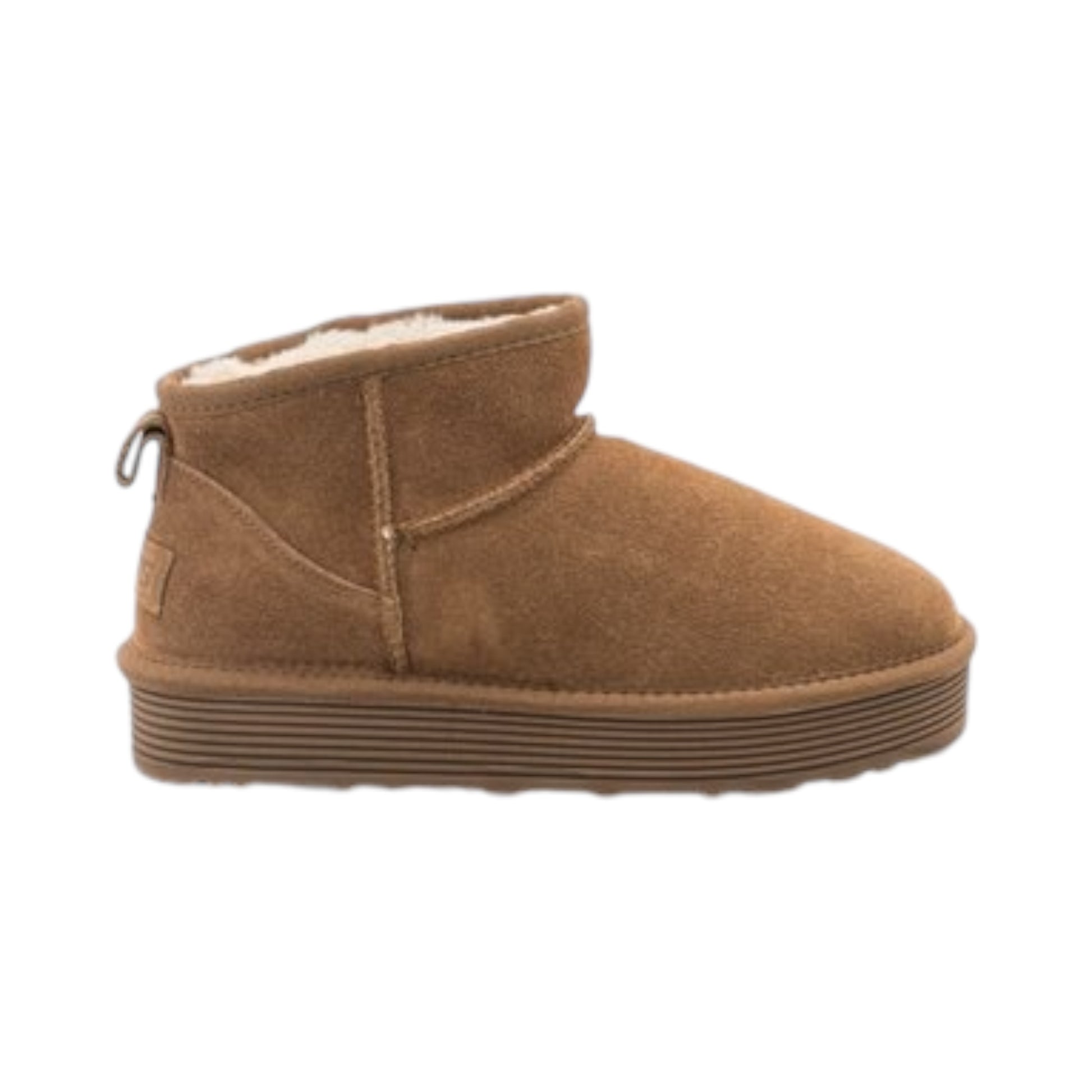 stivaletto modello Ugg donna camel scamosciato alto alla caviglia con pelo all'interno. Tomaia in pelle, interno in tessuto, suola in gomma.