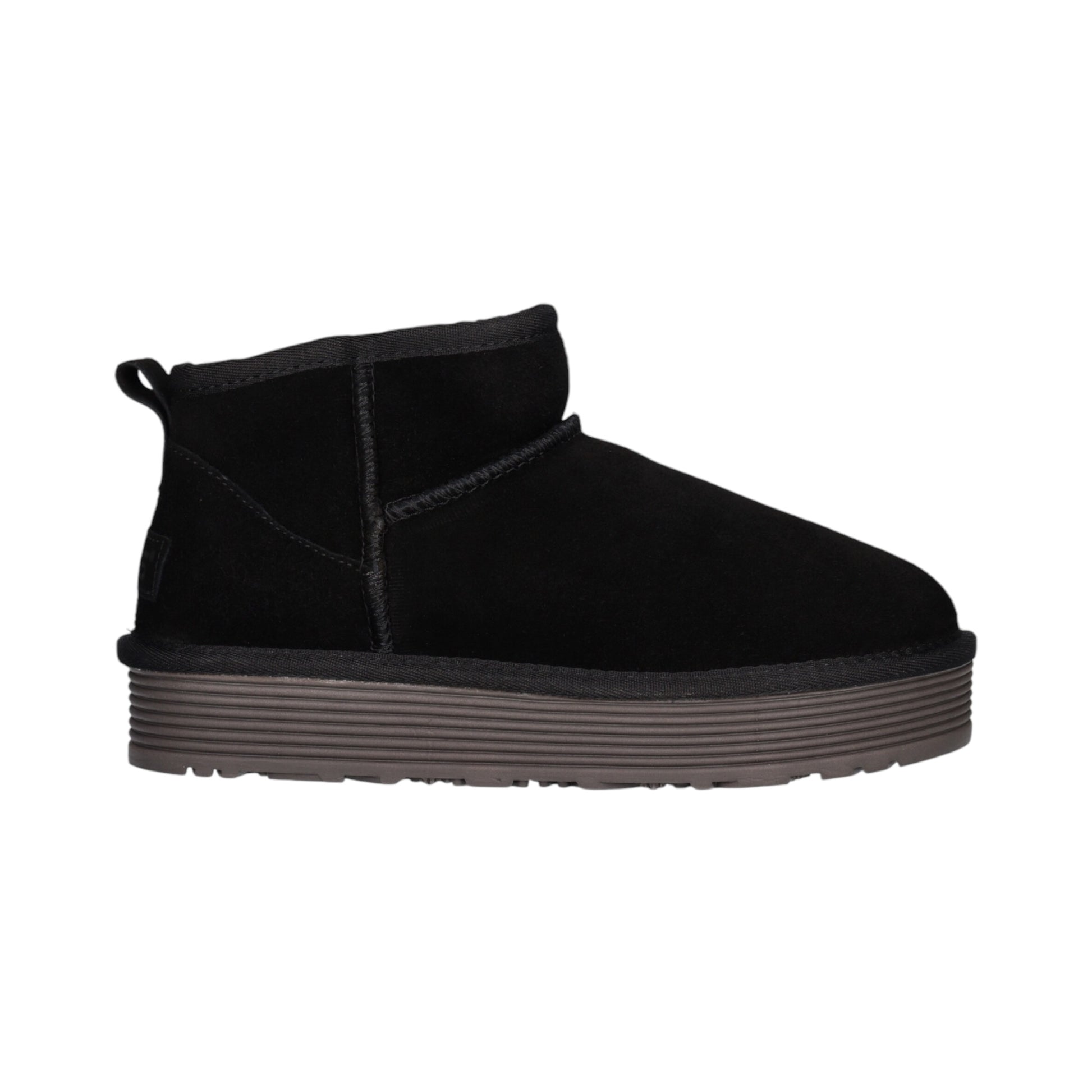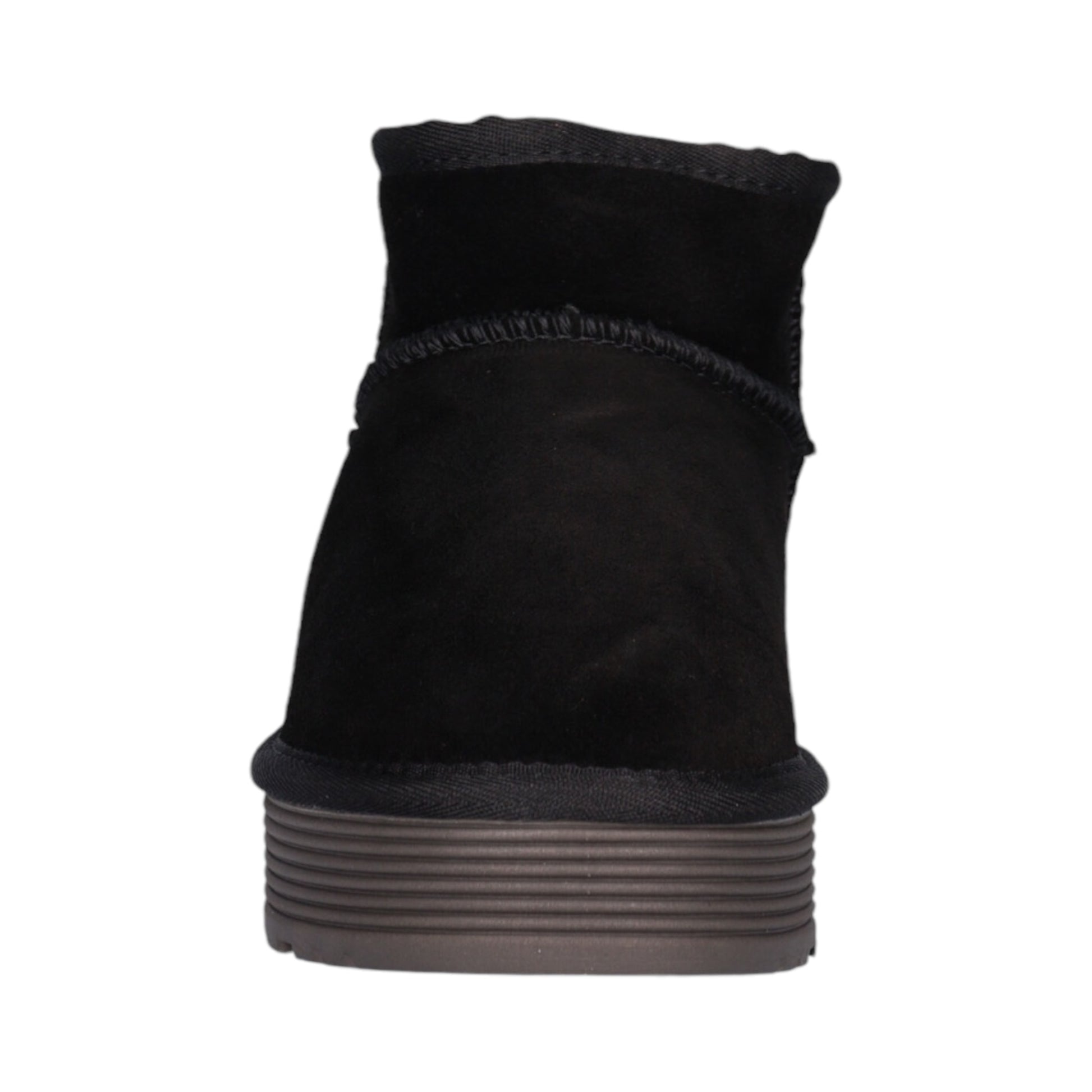 stivaletto modello Ugg donna nero scamosciato alto alla caviglia con pelo all'interno. Tomaia in pelle, interno in tessuto, suola in gomma.