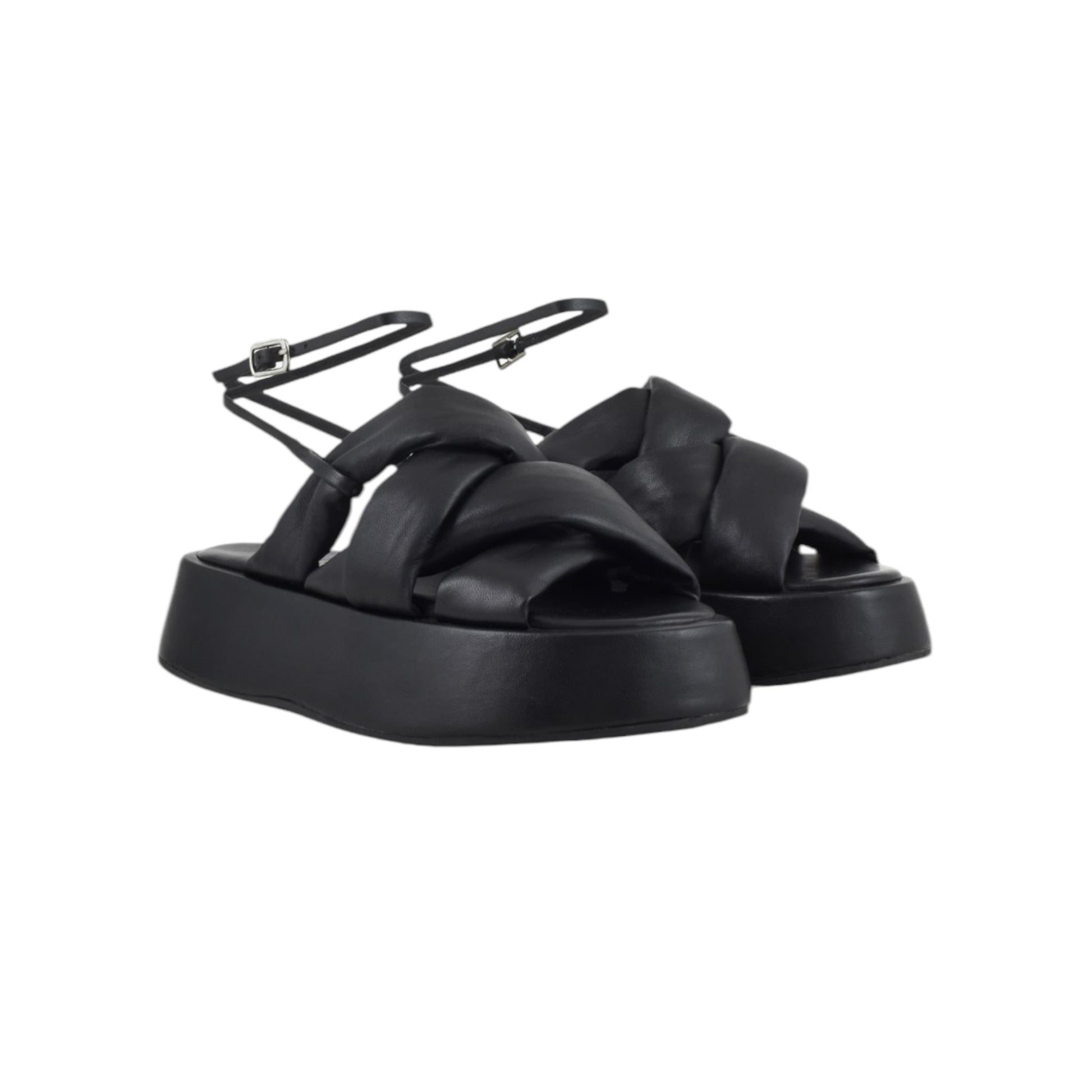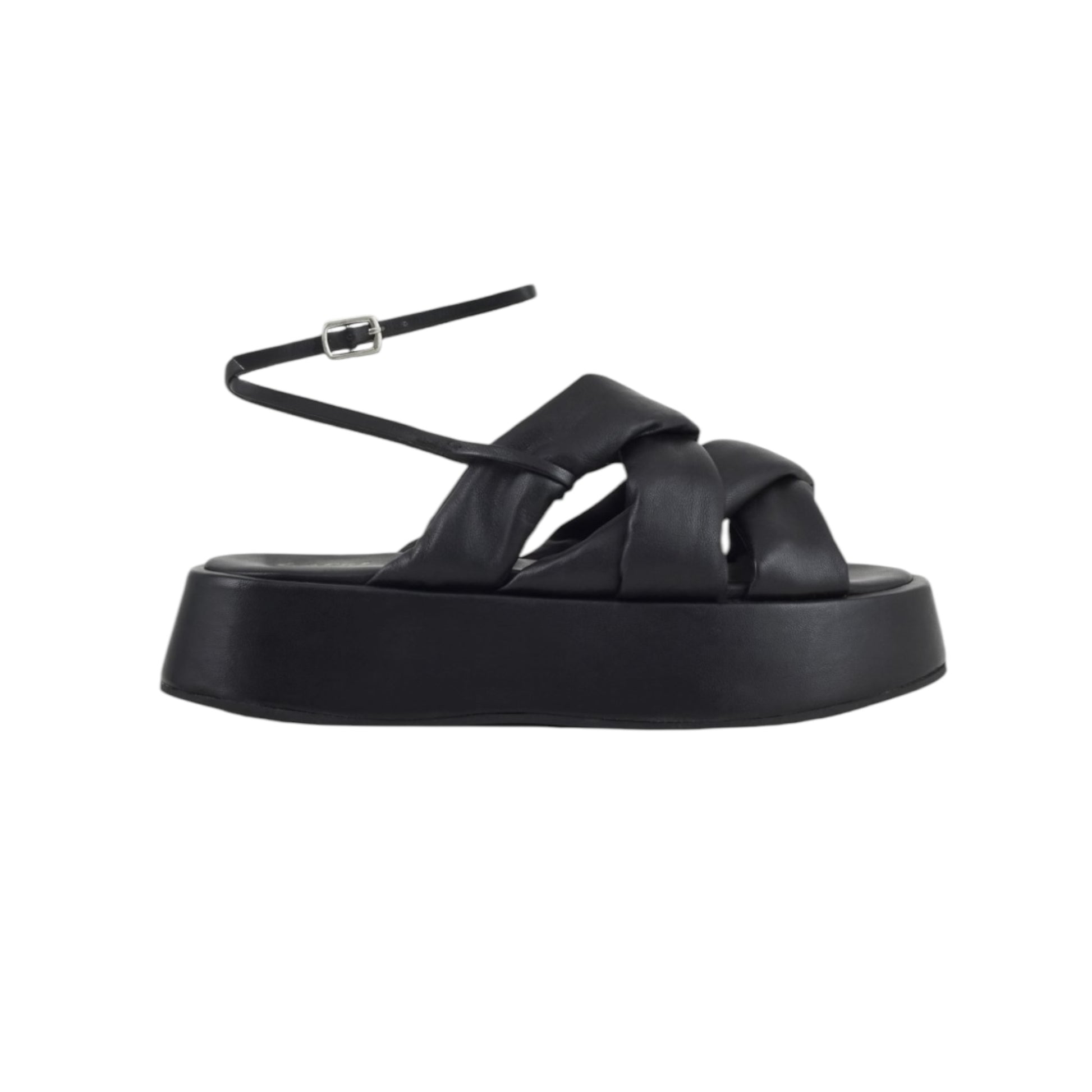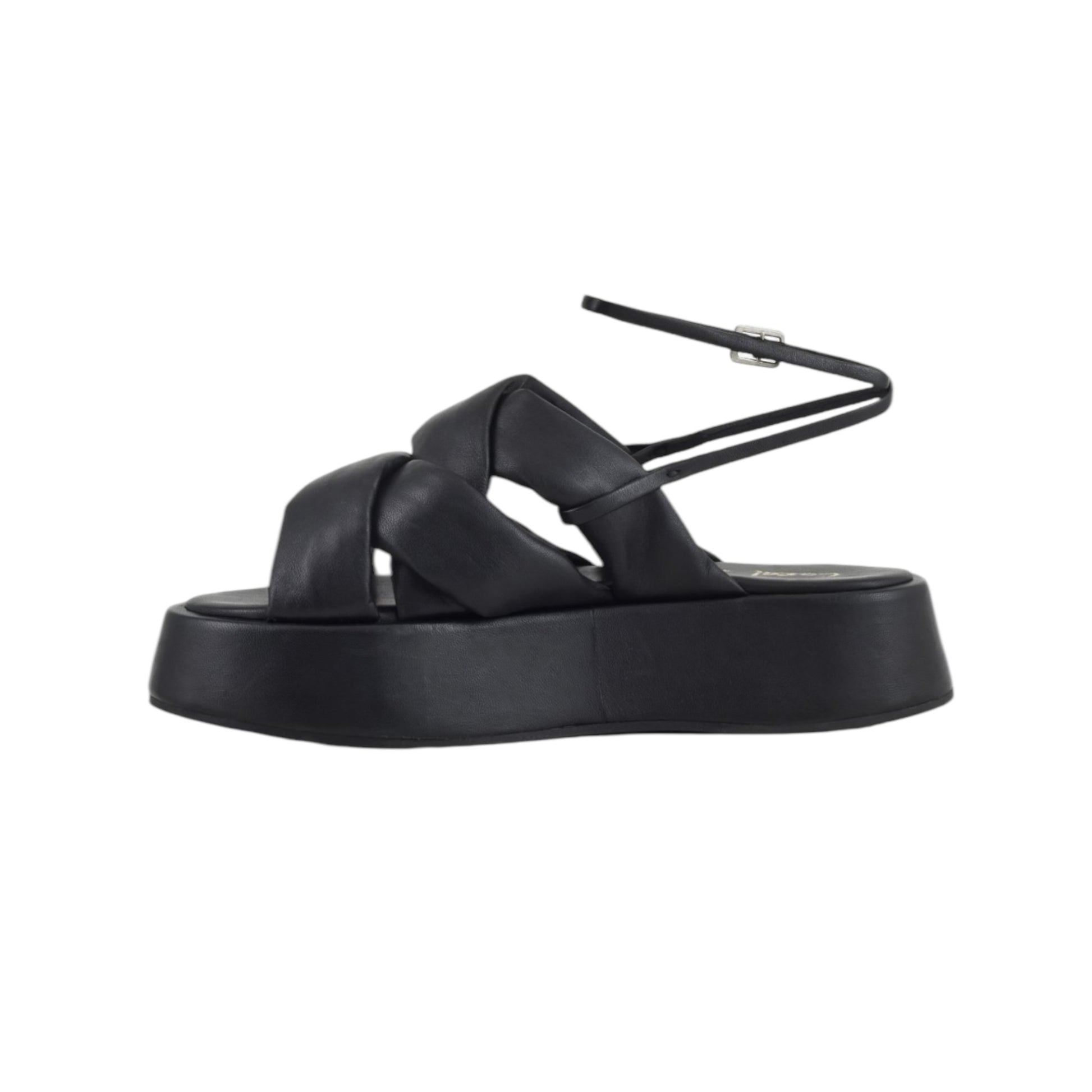 sandali platform di pelle con tomaia intrecciata e leggermente bombata e laccio alla caviglia.