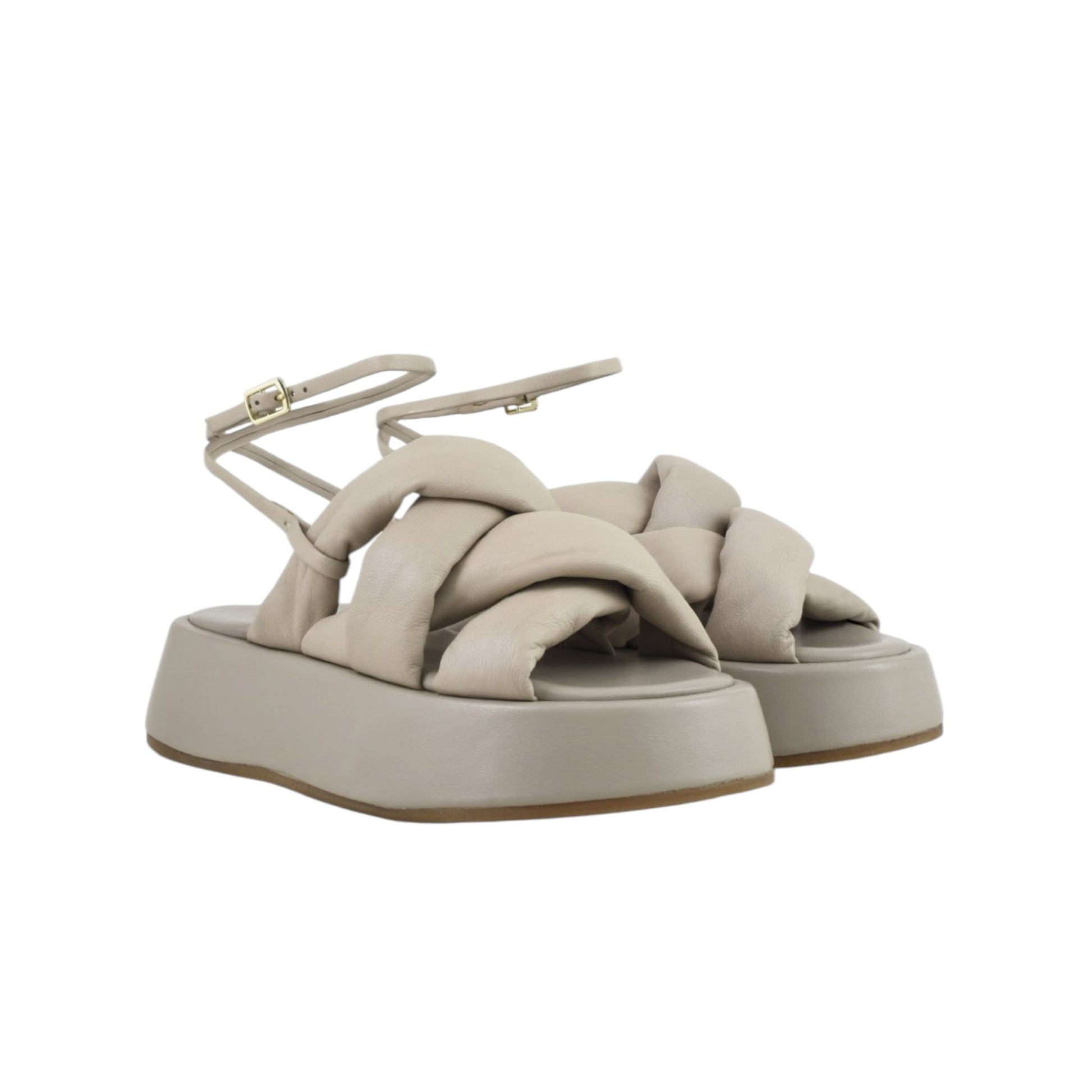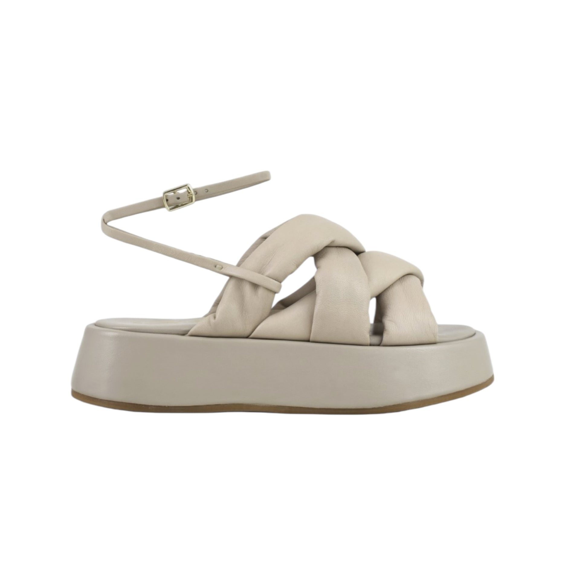 sandali platform di pelle con tomaia intrecciata e leggermente bombata e laccio alla caviglia.